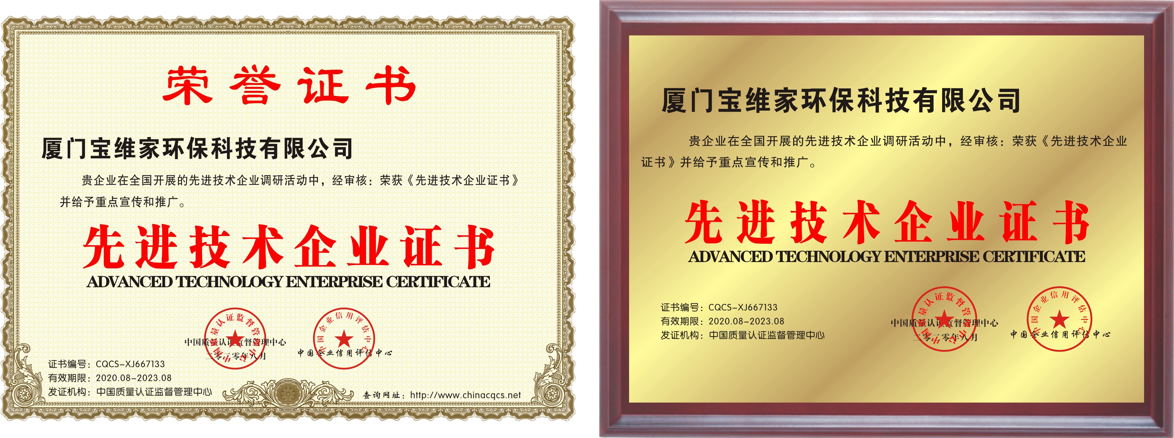 廈門寶維家環保科技有限公司在全國開展的先進激素企業調研活動中,經審核:榮獲《先進技術企業證書》并給予重點宣傳和推廣。