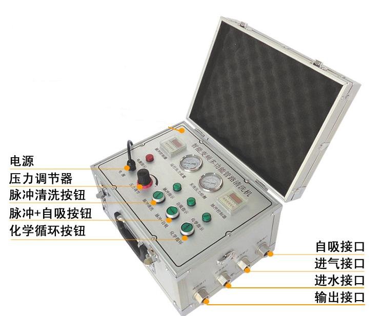 清洗原理:用氣泵提供氣源自來水管道內本身的水,兩種介質,形成多種波段對管內壁進行沖擊和震蕩,逐層剝落并快速排出管外,能快速高效的解決自來水管、地暖管、工業管等管網中多年形成的水垢泥沙、污垢,有效的解決水質差,地熱不然等問題,用最簡單最環保的方法達到最理想的效果